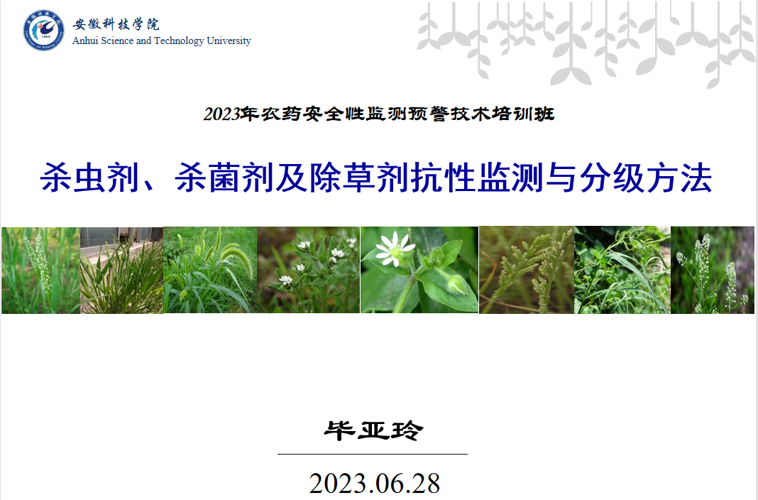 此次培训班共4个报告,分别由中国疾控中心中毒控制中心首席专家孙承业作了题为“农药中毒形势分析及建议”,农业农村部农药检定所环境处周艳明作了题为“农药使用对蜜蜂影响的监测及地下水、地表水、土壤中农药残留的监测方法”,农业农村部农药检定所再评价处李敏作了题为“安全风险监测调查表填写要求及监测技术交流”及我校教师毕亚玲作了题为“杀虫剂、杀菌剂及除草剂抗性监测与分级方法”的专题报告。