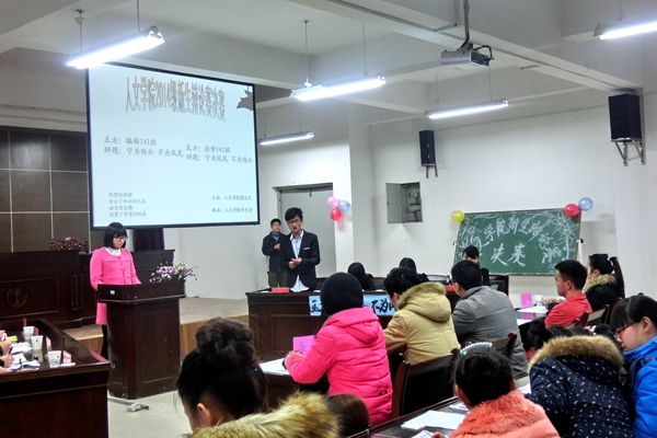 经过一个多月的角逐,12月20日晚,人文学院2014级新生辩论赛决赛在模拟法庭举行。人文学院辅导员黄钦海、管理学院学生会主席吴周健、外国语学院学生会副主席苌园、城市建设与环境学院学生会副主席周为莉、特邀评委孙长茂应邀出席并担任评委。比赛由胡丽婷主持。