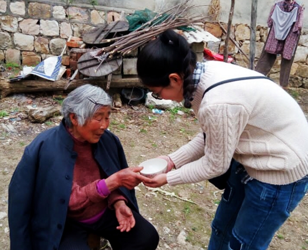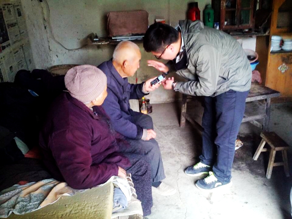 在走访魏洪夏老人家时,志愿者们被魏爷爷当下的生活所深深触动。两间由竹子和水泥土混合搭建的房屋,屋内摆设简陋,一张由木板凳拼接而成的床显得格外扎眼。老人已九十有余,家里老伴患有老年痴呆,还有六十有余的痴呆养子和常年在外打工的女儿,三口之家主要经济来源是政府每季度补助的600元低保补贴,偶尔也带着痴呆的儿子捡些破烂以补贴家用。志愿者们见其家虽简陋却很干净,于是问到有没有什么可以帮忙,老人则说:“有你们这些孩子来看我就已经很感谢了,刚已经拾掇了些柴火,现在也没啥事了,你们大学生不嫌弃我们,跟我们聊天就已经很感激了呀。”志愿者们见状便纷纷坐在老人身边陪其聊天,当说起常年在外打工的女儿时,一位志愿者便急忙拿出手机,教老人使用手机,还替他拨起了女儿的电话,以解老人思念女儿之情。在离开魏爷爷家时,老人双手紧握一位志愿者,连连道谢,志愿者们则纷纷表示以后还会经常来陪爷爷唠家常。