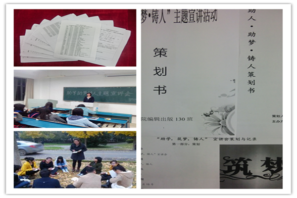 动员大会召开后,各班级积极响应号召,纷纷开展了形式多样的活动。截止11月19日,共上交征文60余篇,图片30余幅,各班级均提交了主题宣讲会策划书、活动流程及总结。如,编辑130班的宣讲活动主要包括受助生畅谈感想和生活委员总结。编辑141班不仅有四位受助人上台讲述了自己或者他人的奋斗史,还播放了一段关于中国达人秀冠军卓君的故事的视频,给了与会同学很大启发。编辑142班通过受助者的生活和讲述别人的故事来激励我们为青春而奋斗,努力为青春创造意义。