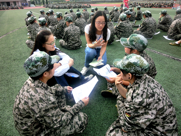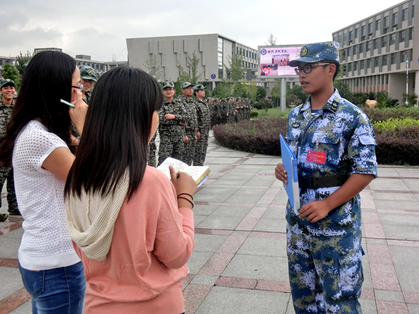 记者随机采访了一位来自编辑出版专业的李阳光同学,他告诉记者:“军训确实有点累,但从没想过退缩,这不是一个军人该有的态度,我会从中得到很多锻炼。”旁边,法学专业的薛云开笑道:“教官很友善,会教交我们唱军歌,我也在军训中交了很多朋友,感觉很好。”可见军训不仅磨练意志,更能促同学之间的交往。