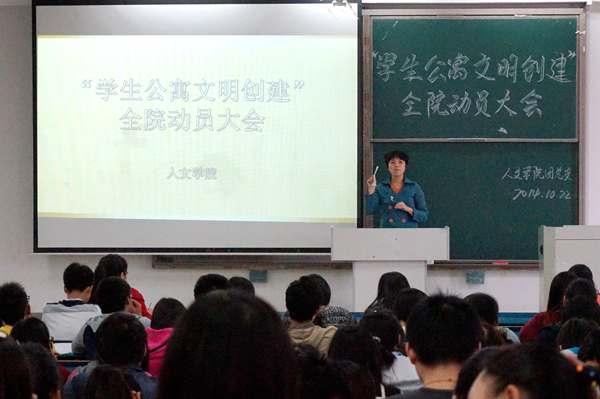 在动员大会召开前,为了掌握全院宿舍卫生和文明状况,给大会提供事实依据和一线资料,10月21日晚,人文学院党总支副书记杜士凤率领全体辅导员和部分班干分两组深入宿舍进行突击摸底检查,取得了大量宿舍现状照片资料。大会开始后,李沙娜首先通报了本次突击检查的整体情况,随后,将检查获得的典型的宿舍卫生和文明图片资料通过PPT向全体与会人员做了现场展示。典型图片内容写实详尽,让与会干部感受到学生公寓文明创建的迫切性和重要性。