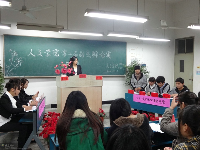 11月17日晚,人文学院第二届新生辩论赛决赛暨颁奖典礼在求知楼B101举行。思政部赵仁青老师、辅导员黄钦海老师、上届校级辩论赛优秀辩手吴倩倩、张淼以及人文学院学生会主席鲍传宏应邀出席并担任评委。比赛由刘畅主持。