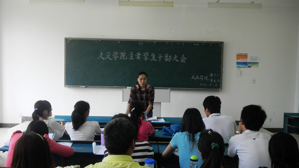 5月16日下午,人文学院在新知楼A109召开主要学生干部大会。人文学院党总支秘书、团总支副书记李月月以及团总支黄钦海老师出席会议。来自09、10和11级各班的班长、团支书和学习委员参加了会议。