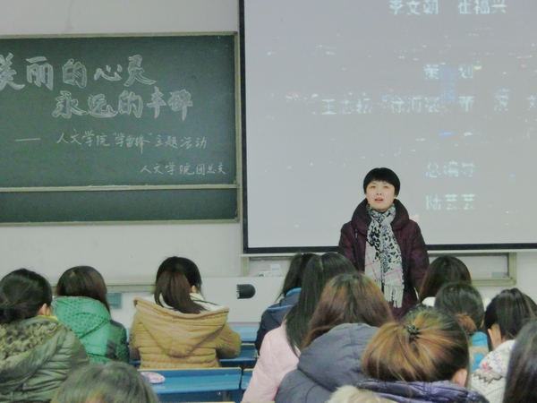 3月8日下午,人文学院在新知楼B303举办了弘扬雷锋精神教育影视讲座,全院党员、学生会干部、记者团以及院青年志愿者协会成员观看了讲座。人文学院党总支副书记杜士凤,辅导员黄钦海出席并同大家一起观看了纪录片《世纪雷锋》。