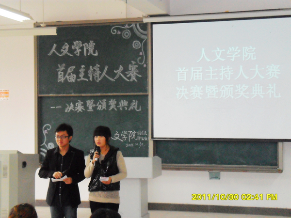 10月30日下午,人文学院首届主持人大赛决赛在新知楼A208隆重举行。辅导员黄钦海老师、校广播站优秀播音员孙波涛、院学生会副主席郎祤辰、院主持队队长王妍以及院朗诵队优秀队员马斌担任比赛评委。徐俊杰、黄慧敏主持比赛。