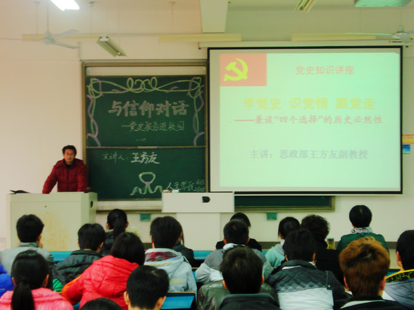 12月6日下午,人文学院在新知楼B102举办“与信仰对话—党史报告进校园”专题报告会。思政部王方友副教授应邀担任主讲。党总支副书记杜士凤主持报告会并和2011级学生一起聆听了报告。