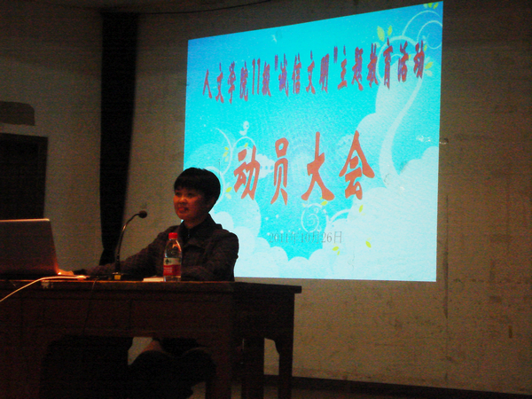 晚,人文学院2011级“诚信文明”主题教育动员大会在学术报告厅隆重召开。人文学院党总支副书记杜士凤主持大会,2011级全体新生参加。