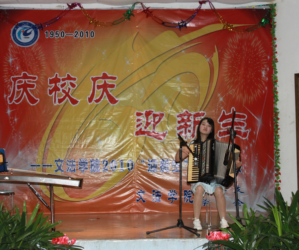 晚会在激情四射的摇滚乐队表演中拉开帷幕。围绕“庆校庆·迎新生”主题,依次上演的节目精彩纷呈,文法学院舞蹈队的《茉莉花》舞姿动人;拉丁舞劲力十足;新生小品搞笑逗趣;文法学院朗诵队《校园情》诗朗诵深情款款;古筝、手风琴器乐演奏余音绕梁;花鼓队表演更是喜气洋洋。姚大怀老师一首激情的诗歌朗诵《黄河颂》更是将晚会推向高潮。