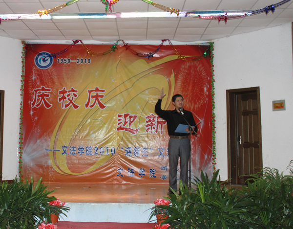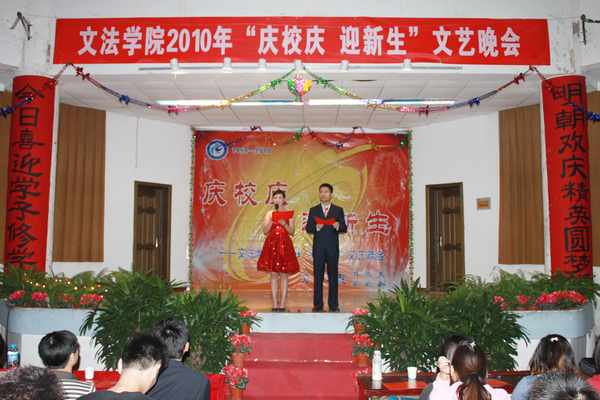 “今日喜迎学子修学,明朝欢庆精英圆梦”。9月26日晚,文法学院在学术报告厅隆重举行2010年“庆校庆·迎新生”文艺晚会。文法学院党总支书记王有炜、文法学院院长吴贵春、校团委副书记施培智、文法学院党总支副书记杜士凤、文法学院副院长李森林等领导以及文法学院教师苏兆龙、姚大怀、黄钦海等应邀观看了晚会,方青、张旭成担任晚会主持。