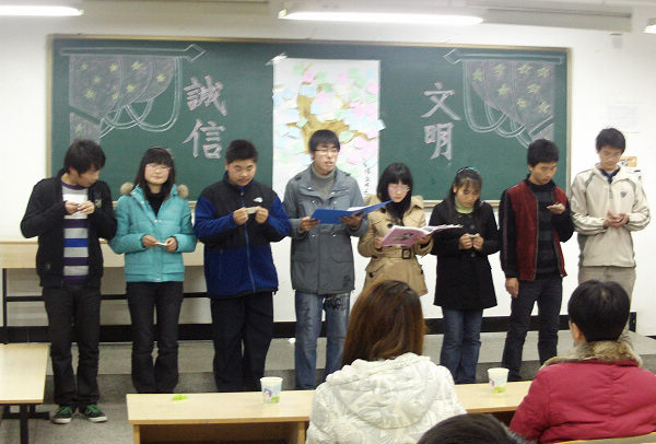 活动采用了“诚信文明”征文朗诵、案例讨论、小品等多种创新形式表现和阐释诚信文明的深刻内涵。与会同学几乎人人参与,在轻松中思考,在思考中收获。