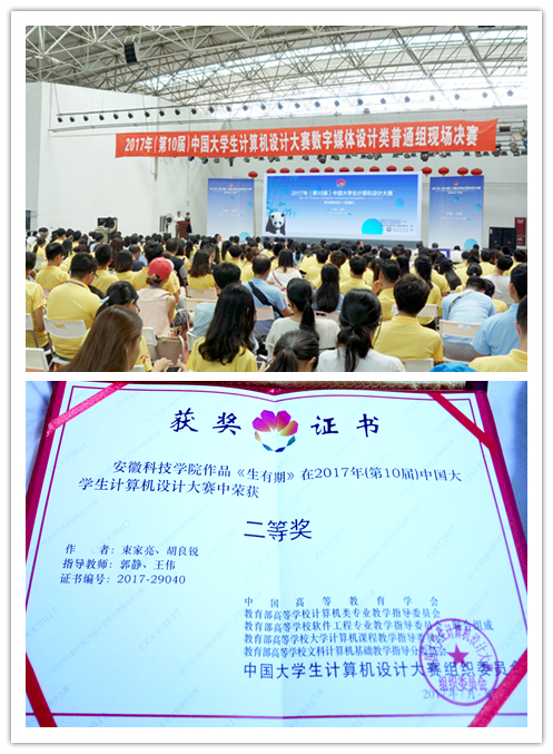 本届中国大学生计算机大赛总决赛(数字媒体类普通组)在成都举办。经过三天的紧张角逐,由37位专家评委严格评审,从全国各地131所本科高校参赛作品中,评选出了一等奖12名、二等奖82名、三等奖123名。束家亮的作品《生有期》立意高远,打破固有思维,从人与动物的互主体性出发,借助节气和书法形象表达自然界的和谐共存,创意新颖,风格素雅。在答辩现场,束家亮发挥出色,讲解流畅自然,第二作者胡良锐当场进行书法表演,获得评委一致好评。此前,在领队老师王伟、指导老师郭静历时两个月的精心打磨下,该作品曾荣获安徽省级赛一等奖,并代表安徽高校参加全国总决赛。