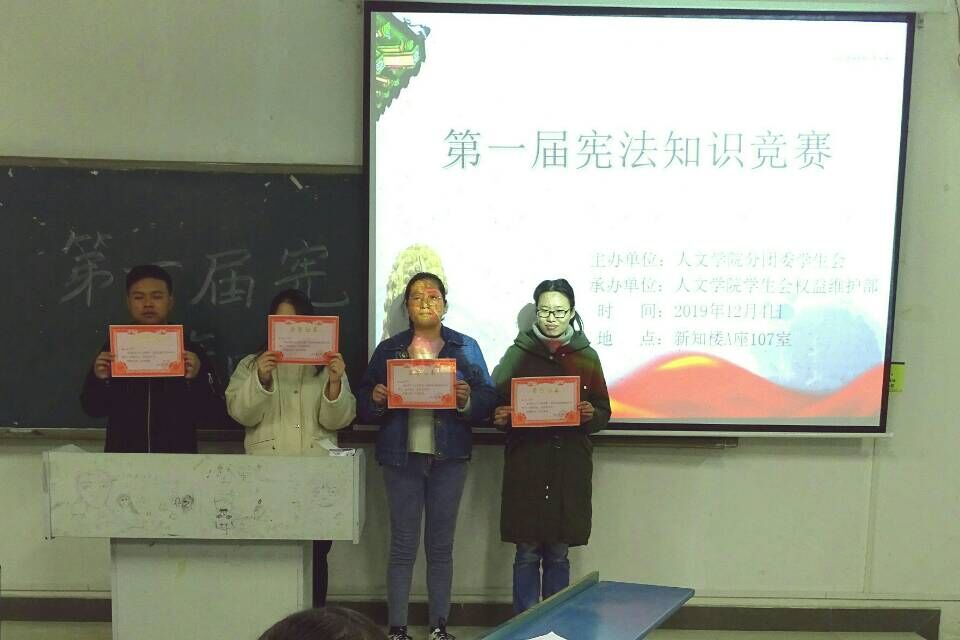 4号下午,在新知楼A105和107教室,人文学院又举办了宪法知识竞赛。通过赛前的充分准备,参赛选手们都对宪法知识有了较为全面的认识,面对小组赛中紧张激烈的抢答、必答等环节,选手们也都显得胸有成竹、处变不惊,有条不紊的回答问题。经过一段时间的比拼和团队成员间的协同作答后,最终,“不殆”队一马当先、拔得头筹,获得比赛一等奖;“最强大脑”队、“法法”队获得比赛二等奖,“尼姑庵”小分队、“法寓行”队、“啥都对”队获得比赛的三等奖,“阁下”队、“温柔一刀”队、“文武双全”队、“看心情”队获得优秀奖。而相对于比赛的结果,选手们收获更大的是头脑中的知识和思想上的洗礼。