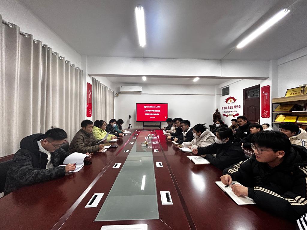 12月13日,人文学院在学知楼324会议室召开学风建设推进会暨诚信文明考试动员会。学院党委副书记李沙娜、全体辅导员及各班级班长、学习委员参加,会议由团委副书记焦雪松主持。