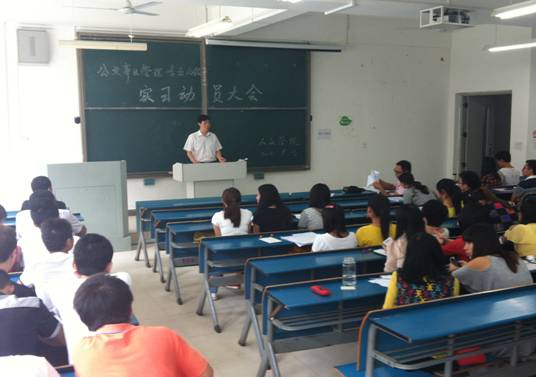 为指导学生做好专业实习工作,9月13日上午,人文学院在新A104教室举行了2010级公共事业管理专业实习动员大会。人文学院副院长王培章,公共管理系主任张杰、副主任秦红霞、姚庆以及班主任黄钦海出席本次大会。2010级公共事业管理专业全体同学参加了大会。