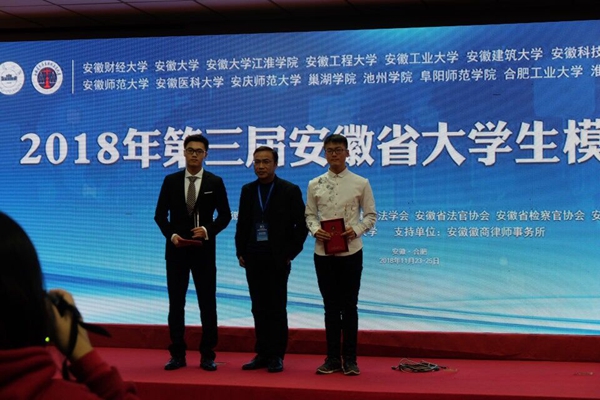 本次大赛由安徽省教育厅主办,安徽省法学会、安徽省法官协会、安徽省检察官协会、安徽省律师协会协办,安徽大学承办。通过参赛,加强了我校和各兄弟院校之间的沟通交流,展示了我校学子丰富的理论知识和良好的精神风貌。(特约通讯员:高晓宁)