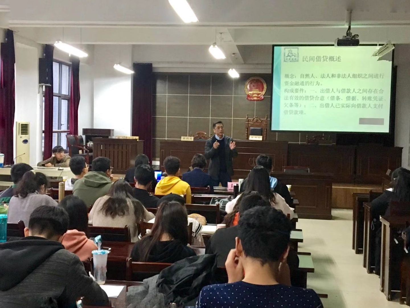 11月17日下午,“知秋杯”第一届博业体育(中国)官方网站-登录入口法治论坛系列活动——“以案说法”在模拟法庭举办。安徽大友昱达律师事务所执行主任杨根宝作“民间借贷纠纷实例分析”主题报告。安徽大友昱达律师事务所律师王苏敏、安娟、黄娜、潘亮等受邀出席。活动由人文学院院长助理骆绪刚主持。