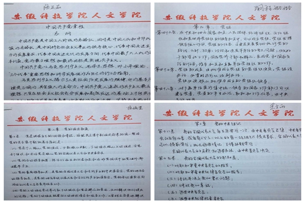 学习中,法学学生党支部切实按照“逐条逐句通读党章”的要求,引导党员尊崇党章、遵守党章、维护党章,就如何做好一名合格的党员,结合党员的自身情况进行了思考与讨论。“手抄党章”活动得到了支部全体党员的积极响应,通过手抄,进一步加深了对党章的认识和理解,以手抄党章为起点,以学习党章、遵守党章为标准,从内心提高党员素质。