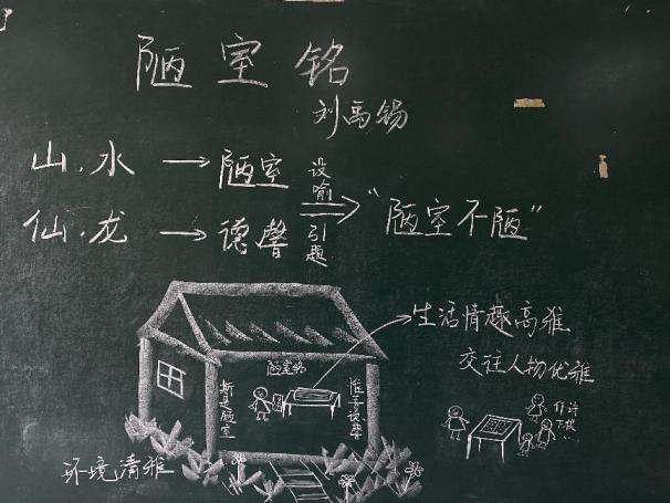 板书:在房子边上画出花草和布满苔痕的台阶,写上:环境清雅