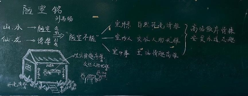 一是从室外景 通过描写居室自然环境的清雅,二是从室内人 通过描写主人交往人物的优雅,三是从室中事通过描写主人日常生活情趣的高雅。这三个雅 极力渲染了陋室不陋,从而表达出作者一种高洁傲岸的情趣和安贫乐道的志趣,不与世俗同流合污的人生态度等等。