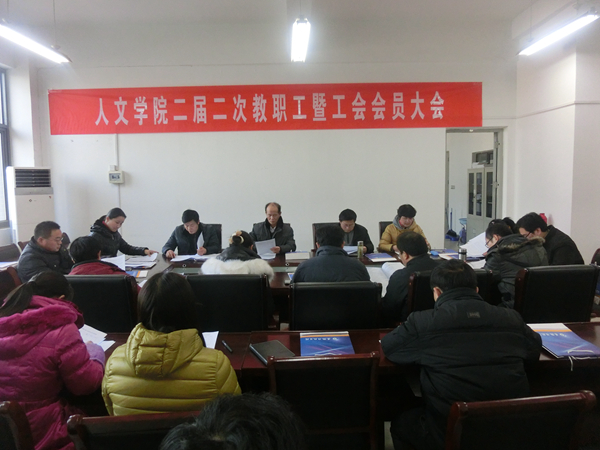 12月31日下午,人文学院二届二次教职工暨工会会员大会在学院会议室隆重召开。学院党政领导和全体教职工参加了会议,大会开幕式由党总支副书记杜士凤主持。