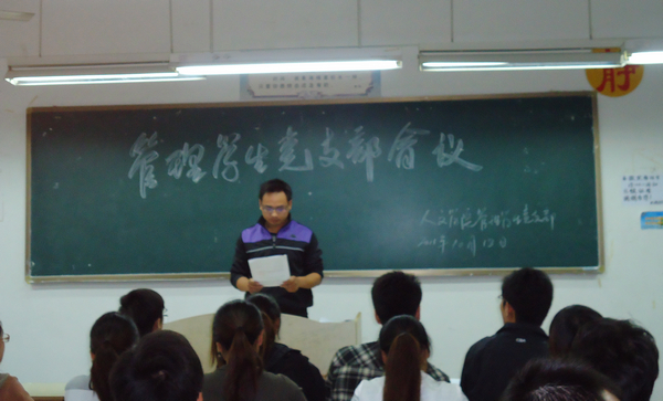 10月18日下午,人文学院管理学生党支部在求知楼B406召开会议学习胡锦涛纪念辛亥革命100周年大会上的讲话。支部全体正式党员和预备党员参加学习。会议由该院支部书记黄钦海主持。