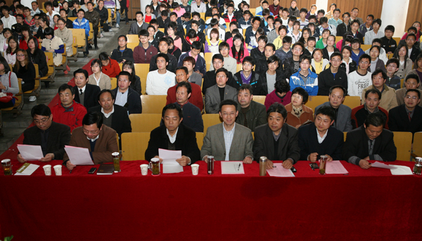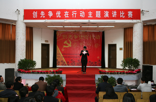 为推进我校创先争优活动的深入开展,进一步营造创先争优浓厚氛围,全面展示我校各级党组织和共产党员昂扬向上的精神风貌和感人事迹,以实际行动迎接建党九十周年,自3月21日,校创先争优活动领导小组办公室部署“创先争优在行动”主题演讲比赛以来,各党总支(直属党支部)认真筹备,积极推选优秀选手参加比赛。4月11日下午,主题演讲比赛决赛在学术报告厅举行。