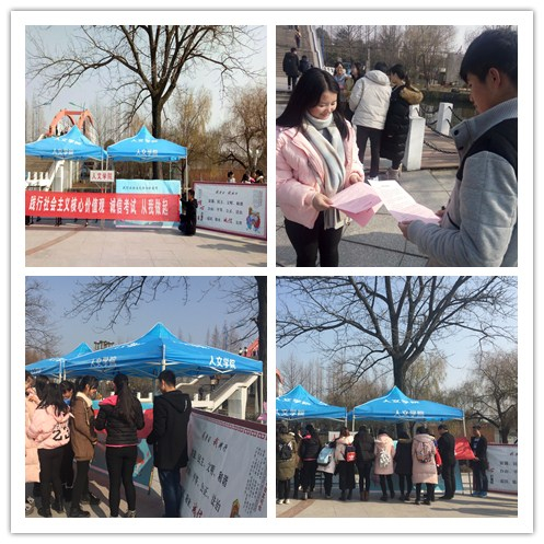 为践行社会主义核心价值观,增强诚信意识,进一步营造良好的学习考试氛围,12月31日中午,人文学院学生会在西区小广场举办了“践行社会主义核心价值观,诚信考试,从我做起”宣传活动。