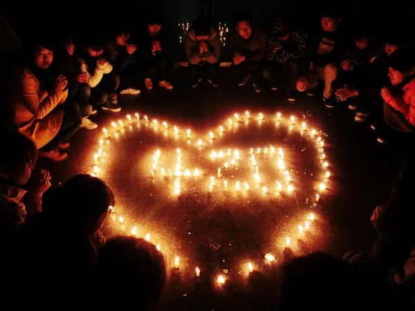 雨夜中,新A与新B之间的走廊格外的寂静,同学们共同点燃蜡烛,组成包围着“4·20”字样的心形,大家围在烛光旁紧闭双眼,合起双手,为在雅安地震中遇难同胞默哀三分钟,寄托哀思。 天空正下着雨,走廊上刮来阵阵冷风,寄托着哀思与美好祝愿的蜡烛几次被风吹灭,但同学们都自觉地将身边的蜡烛再次点燃,继续默默虔诚地祈祷。