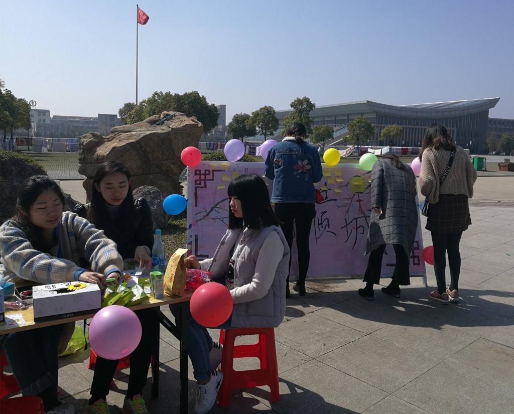 活动当天,迎着明媚的春光,心联成员在西区天桥下摆设站台和展板,举行“写心愿,抽大奖”的活动。路过的女生纷纷驻足参与,写下一张张小小的心愿贴到心愿墙上,然后在纸箱中随机抽奖。女生的心愿则由路过的男生或心联男生为其实现。活动现场人头攒动,写下心愿的女生脸上洋溢着快乐的笑容。