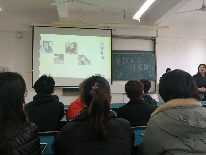下午,人文学院又在新知楼B304教室举办了一场以“关注三七,与你同行”为主题的心理知识讲座。讲座由校法新社副会长侯胜男主讲。她借助实际案例提醒女生们如何在现实生活中保护自己,提高自我防范能力。讲座为每一位同学敲响了安全的警钟,现场的同学也深深地意识到学会自我保护的重要性。