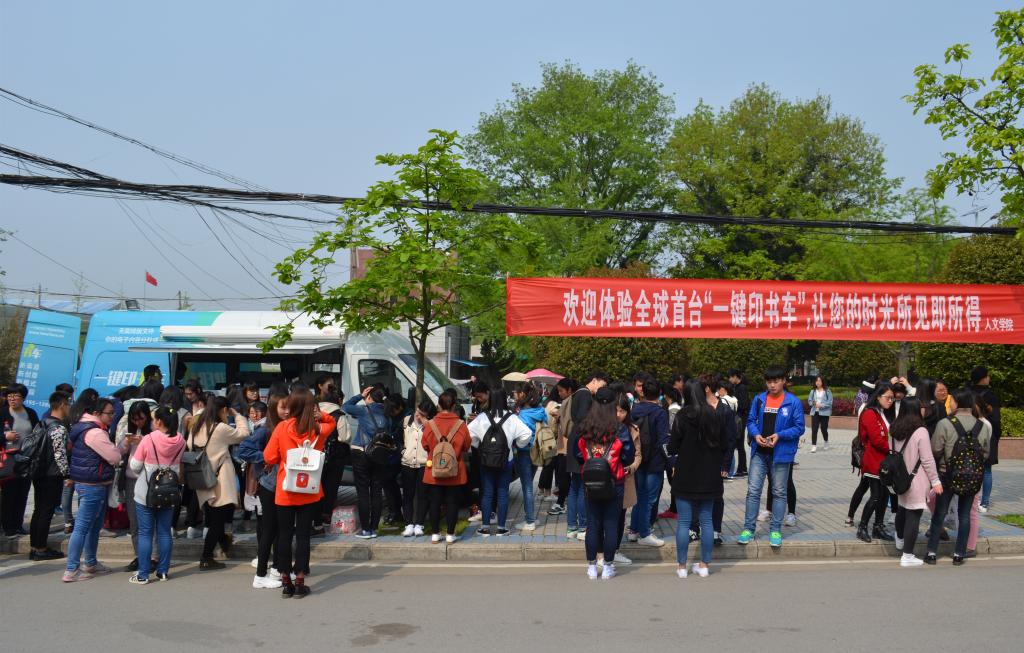 孙立一行,还将自主研发的全球首辆无需任何排版即可现场印制成书的“一键印书车”开进校园,为学生现场展示图书的制作过程。新媒体产品“时光圈”纪念册制作也受到了学生的广泛关注。