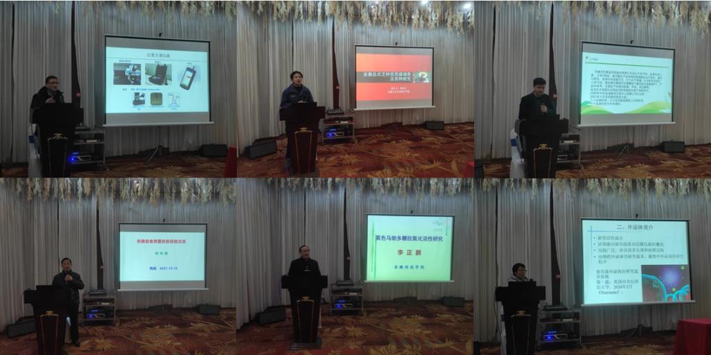 中国科学院合肥物质科学研究院黄青研究员,安徽大学吴旺宝教授,砀山县亲耳菌业有限公司蒋鹏总经理,博业体育(中国)官方网站-登录入口何华奇副教授、李正鹏教授、蒋圣娟教授等九位专家,分别做了“灵芝多糖和三萜成分光谱检测方法研究”、“金寨县灵芝种质资源调查及育种研究”、“砀山县果枝木耳扶贫经验交流”、“安徽省食用菌产业扶贫经验交流”、“羊肚菌栽培高产环境因子研究”、“紫色马勃多糖抗氧化活性研究”、“猴头菇外泌体初步研究”等专题报告。