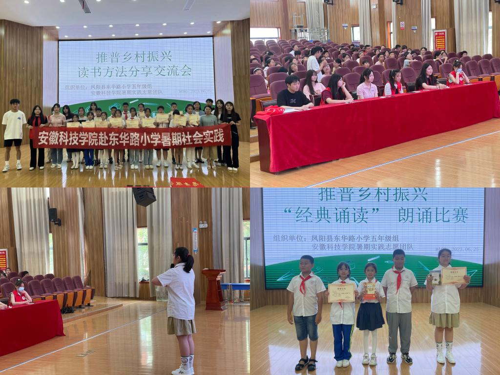 为践行爱国主义教育,助力普通话推广任务。生命与健康科学学院“奉献暖人心”社会实践团队来到凤阳县府城镇东华路小学,自6月25日起,开展为期三天的以“阅读经典、诵读经典”为主题的社会实践活动。团队负责人张志通过与该校五年级组长进行沟通对接,开展了诵读经典朗诵比赛和读书方法分享交流会的活动,全体五年级同学参与并观看。