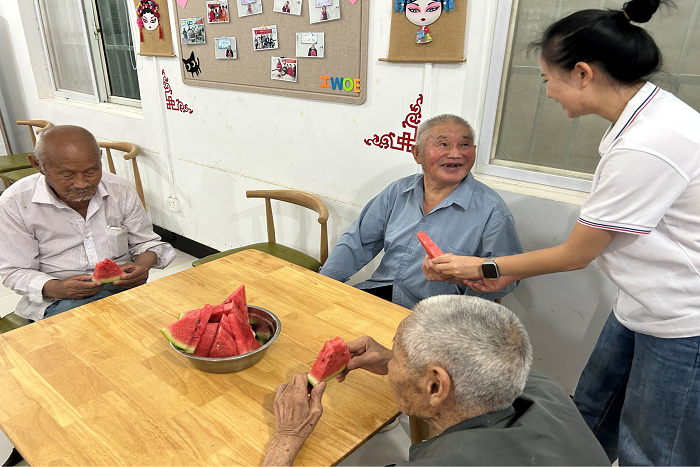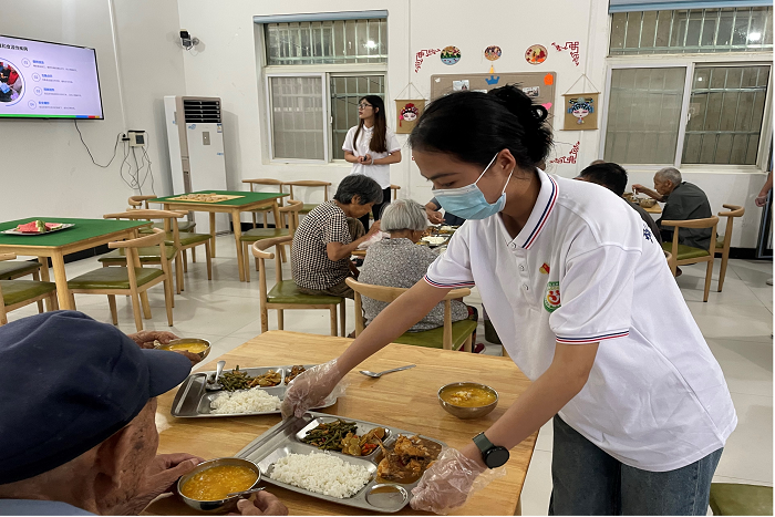 在养老组餐点,团队成员们与老人们亲切交谈,询问他们的身体状况和生活需求,耐心倾听老人们的故事与心声。他们不仅为这里的老人送去了新鲜可口的水果,还亲手为他们分发了热腾腾、营养均衡的餐食,用实际行动诠释了尊老敬老的传统美德。