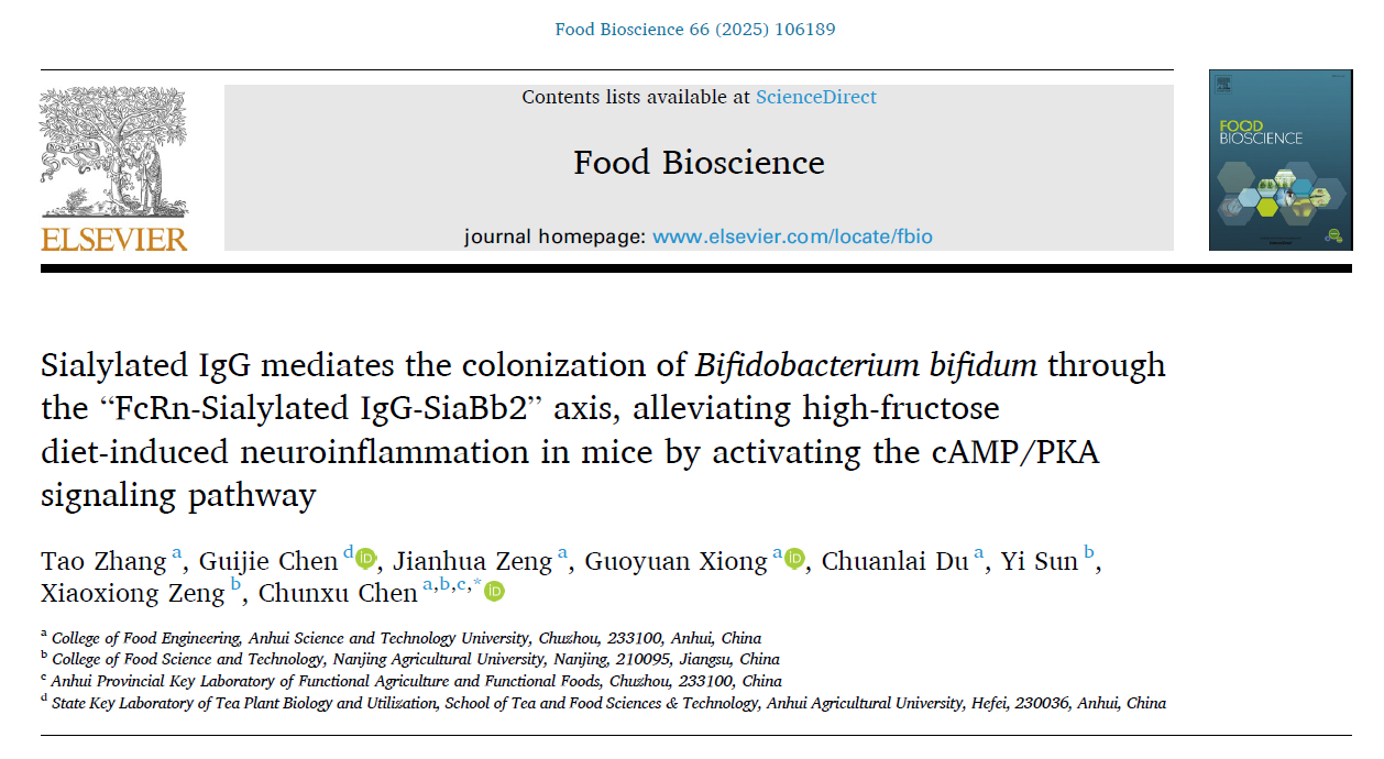 近日,食品科学与工程学院陈春旭副教授以通讯作者身份在国际Top期刊《Food Bioscience》(Q1,影响因子4.8)发表了题为“Sialylated IgG mediates the colonization ofBifidobacterium bifidum through the “FcRn-Sialylated IgG-SiaBb2” axis, alleviating high-fructose diet-induced neuroinflammation in mice by activating the cAMP/PKA signaling pathway”的研究论文,论文的第一作者为博业体育(中国)官方网站-登录入口2023级食品加工与安全专业硕士研究生张涛,博业体育(中国)官方网站-登录入口为第一完成单位,南京农业大学曾晓雄教授课题组为合作单位。