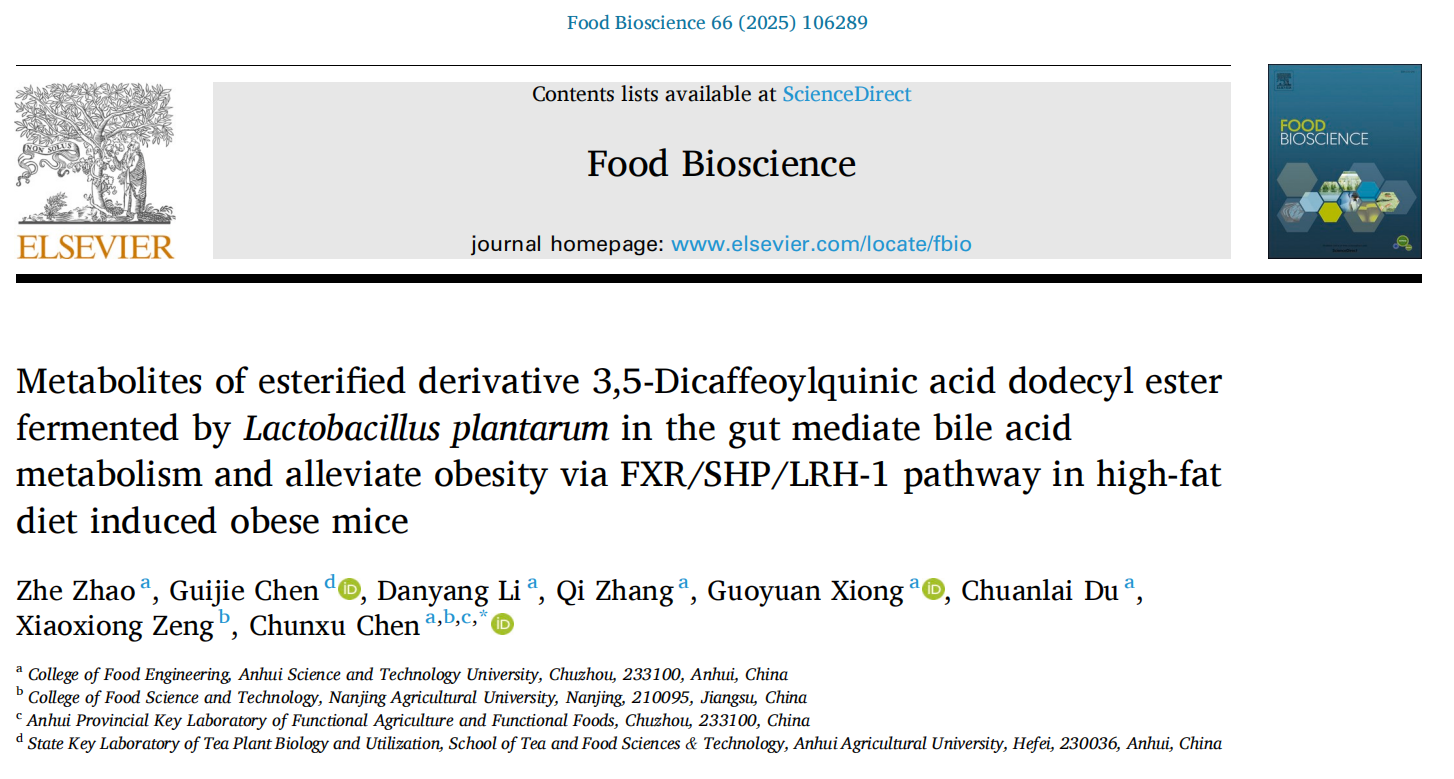 近日,食品科学与工程学院陈春旭副教授以通讯作者身份在国际Top期刊《Food Bioscience》(Q1,影响因子4.8)在线发表题为“Metabolites of esterified derivative 3,5-Dicaffeoylquinic acid dodecyl ester fermented by Lactobacillus plantarum in the gut mediate bile acid metabolism and alleviate obesity via FXR/SHP/LRH-1 pathway in high-fat diet induced obese mice”的研究性论文。博业体育(中国)官方网站-登录入口2022级食品加工与安全专业硕士研究生赵哲为论文的第一作者,博业体育(中国)官方网站-登录入口为论文第一完成单位,南京农业大学曾晓雄教授课题组为合作单位。
