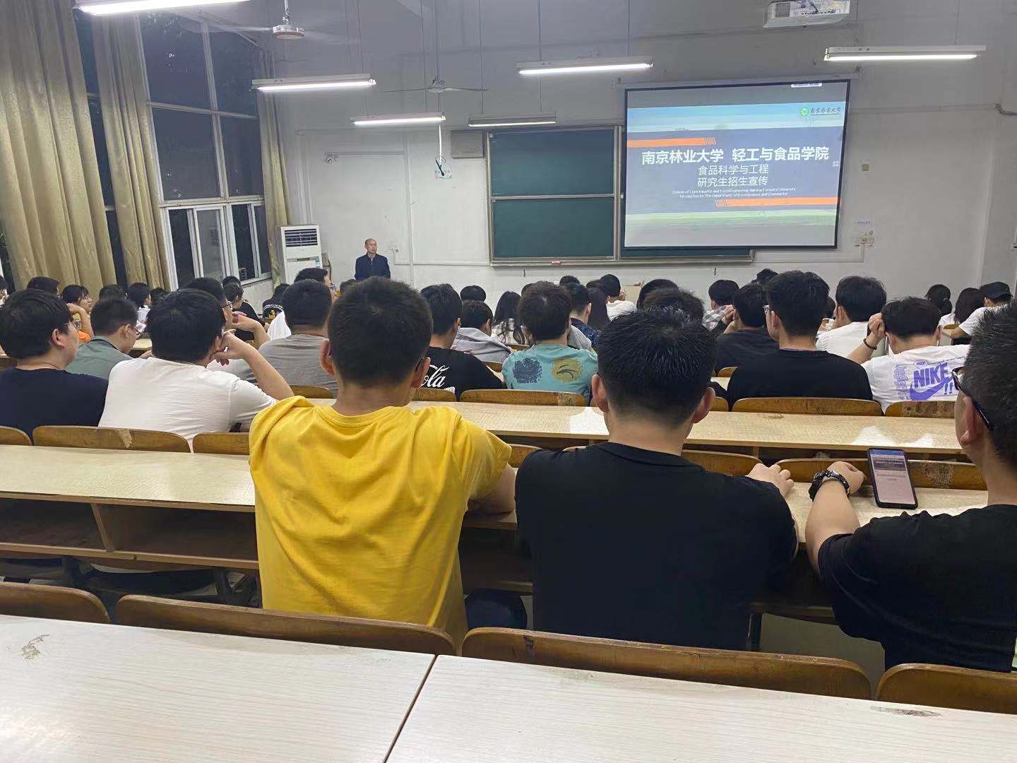 座谈会后,王佳宏给食品工程学院2022届毕业生开展了一场考研辅导讲座,他详细介绍了南京林业大学基本校情、研究生教育概况(学位点、师资、培养模式、奖助体系、各类研究生招生政策等)和相关学科研究生教育的优势与特色,讲座现场学生踊跃提问,气氛热烈。
