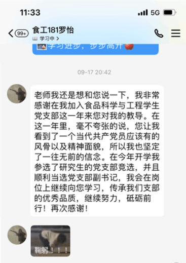 吴玘老师在支部书记岗位上身体力行的示范作用,在支部党员中产生了强大的影响力,培养了一批优秀的学生党员,她所在党支部2022届毕业生党员中有12名考取南京农业大学、南昌大学、苏州大学等名校硕士研究生。食品科学与工程181班罗怡在支部关心鼓励下,今年考取了南昌大学生物与医药专业,当选为研究生党支部副书记,她第一时间与吴玘老师分享了喜悦,她说:“老师,非常感谢在我加入食品科学与工程学生党支部这一年来您对我的教导。毫不夸张地说,您让我看到了一个当代共产党员应该有的风骨以及精神面貌,所以我坚定了一往无前的信念。在今年开学我参与了研究生的党支部竞选,并且顺利当选党支部副书记,我会在岗位上以您为榜样,继续向您学习,传承我们支部优秀的品质,继续努力,砥砺前行!” 学院党委书记付光玺这样评价吴玘老师:“如果把吴玘放在庞大的人群中你很难发现她,但一旦你关注到了她,她就能像一束光一样照亮别人,更能像一团火一样温暖他人,她是一个身材渺小、心灵伟大的人,是一个能够坚定传递正能量的人!”