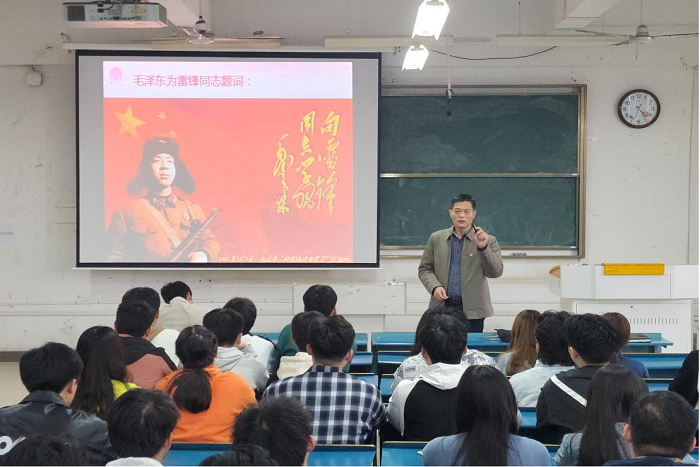 付光玺以“学习雷锋精神,绽放璀璨光芒——平凡中铸就伟大人生”为题,给各位同学呈现了生动精彩的第一课。他指出,今年是毛泽东等老一辈革命家为雷锋同志题词60周年。60年来,学雷锋活动在全国持续深入开展,雷锋的名字家喻户晓,雷锋的事迹深入人心,雷锋精神滋养着一代代中华儿女的心灵。他从“破译关于雷锋的密码”这一问题切入,紧紧围绕雷锋怎么说、雷锋怎么做,与在场师生共同分享伟大的共产主义战士雷锋的感人故事,共同感悟雷锋精神的时代价值,深刻解读了是什么力量在支撑着雷锋一直无怨无悔的为人民做好事?他指出,雷锋是孤儿,是在党和政府关怀下,上了学、读了书、加入了共青团、入了党,正如千千万万的青年一样在党的阳光雨露哺育下茁壮成长,对党和人民心怀感恩。他强调,团组织要不负时代,不负韶华,不负党和人民的殷切期望,深入学习宣传贯彻习近平总书记关于弘扬雷锋精神的重要论述,深刻把握雷锋精神的时代内涵,要把学雷锋活动作为新时代面向青年学生开展思想政治引领的宝贵资源,作为培育和践行社会主义核心价值观的重要抓手,推动学雷锋活动融入日常、化作经常,让雷锋精神在新时代绽放更加璀璨的光芒。团课在全体师生合唱《学习雷锋好榜样》的歌声中圆满结束。