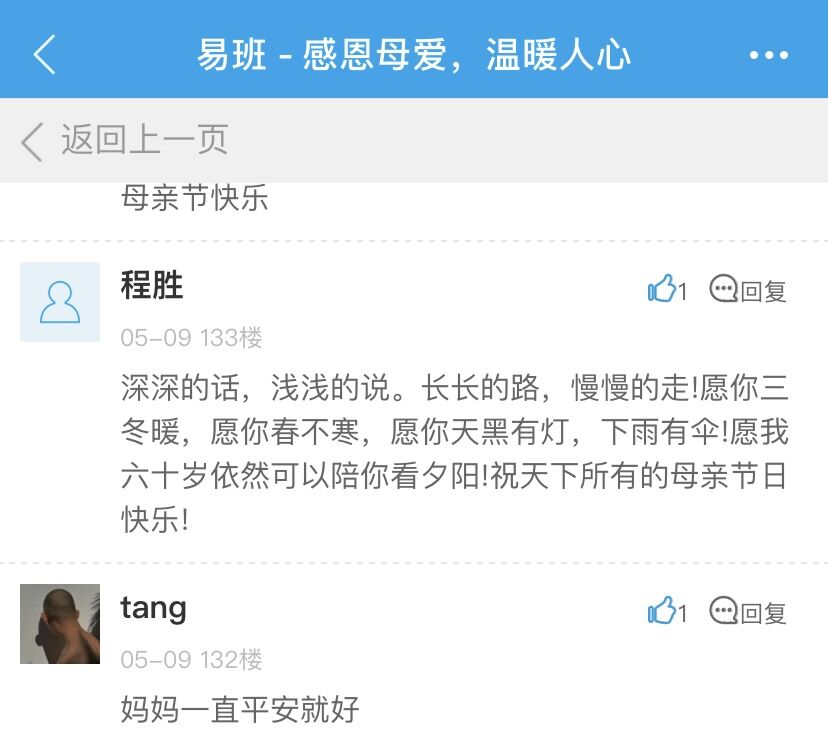 本次活动使用易班APP线上推出轻应用为同学们提供一个“我想对妈妈说”平台,同时在线下申请PU学时,同学们自行签到。在轻应用中同学们可以看到母亲节的由来、习俗、母亲节送妈妈的花朵合集以及母爱的意义等,让同学们在参与活动的同时回忆曾经和妈妈的点滴美好。爱,是产生一切动力的源泉,唯有母亲的爱,才是人类历史上最无私最无杂的情感和奉献。母亲是我们生命源泉的缔造者,也是我们美好生活的创造者。同学们积极踊跃地参与本次活动,用自身行动表达出了对母亲的爱。随着我们的成长,母亲会慢慢老去,所以在以后的生活中,相信同学们一定会抽时间多陪伴她,更加爱我们的母亲。