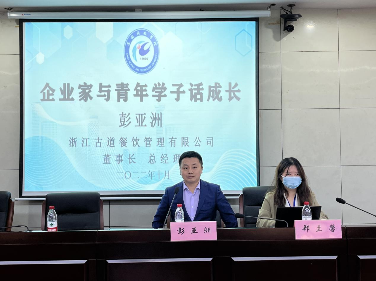 为进一步增强学生的产业行业认知,培育学生创新创业意识,促进毕业生更高质量就业,10月13日下午,食品工程学院邀请浙江古道餐饮管理有限公司董事长、总经理彭亚洲来校与广大青年学子对话交流。对话会由学院党委书记付光玺主持,在新图书馆一楼报告厅举行。副书记王广良、分团委书记赵传磊及全体辅导员、2023届毕业生、部分家庭经济困难学生参加活动。