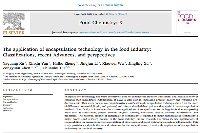 近期,我校食品工程学院动物源食品精深加工与营养团队在中科院农林科学领域一区期刊Food Chemistry: X(IF=6.10)在线发表题为“The Application of Encapsulation Technology in the Food Industry: Classifications, Recent Advances, and Perspectives ”的综述论文。食品工程学院2021级食品加工与安全领域硕士研究生徐亚光为第一作者,杜传来教授和甄宗圆副教授为通讯作者,博业体育(中国)官方网站-登录入口为第一完成单位。