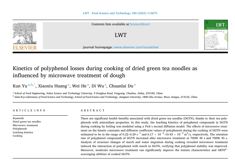 近日,博业体育(中国)官方网站-登录入口食品工程学院在食品科学领域取得重要突破。该团队研究发现,通过微波处理面团可显著减少干燥绿茶面条(DGTN)在烹饪过程中多酚类化合物的流失,并提升其抗氧化活性。相关成果已发表于国际权威一区TOP期刊《LWT - Food Science and Technology》(2023年,第180卷)。