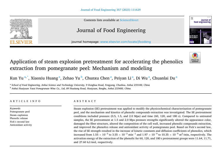近日,博业体育(中国)官方网站-登录入口食品工程学院与安徽怀远亚太石榴酒业有限公司联合团队在食品工程领域取得重要突破。研究发现,蒸汽爆破(Steam Explosion, SE)预处理技术可高效破坏石榴皮细胞壁结构,显著提升多酚类化合物的提取率及抗氧化活性,为石榴加工副产物的高值化利用提供了创新解决方案。相关成果发表于国际权威一区TOP期刊《Journal of Food Engineering》(2023年,第357卷)。