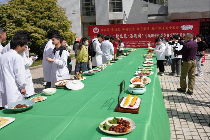 竞赛以高级工标准命题,形式为实操,分指定项目和自选项目。比赛过程中,选手们齐聚一堂,合力上演了一场舌尖上的盛宴。他们基于对徽菜的深刻理解,将理论知识融入到参赛项目中,充分发挥创新思维和个性化的烹饪风格,辅以熟练的刀功和高超的火候掌控能力,将徽菜传统元素与现代烹饪技法相结合,呈现了一道道别具特色的徽菜佳肴。指定项目参赛作品为徽式传统菜品,充分展现出了凤阳特色和文化元素;自选项目作品为徽式创新菜品,深入结合了选手自身技能特长,别具地方特色。“洪武百花扇”“迎客松”“葫芦鸭”等作品栩栩如生,“玫瑰鸡肉卷”“徽式酱排”“松子鲈鱼”等鲜香四溢,一一展现在广大师生面前,令人赞不绝口,也获得评委们的一致好评。现场观众纷纷表示:“第一次见葫芦形状的烤鸭!”“你看那个蛋黄酥,好像一颗颗美丽的星球!”“这道松子鲈鱼真的让我深切感受到了徽菜的魅力!”经过激烈角逐和公正评判,最终共有9人获得技师职业资格,其中中式面点技师1人,中式烹调技师8人。