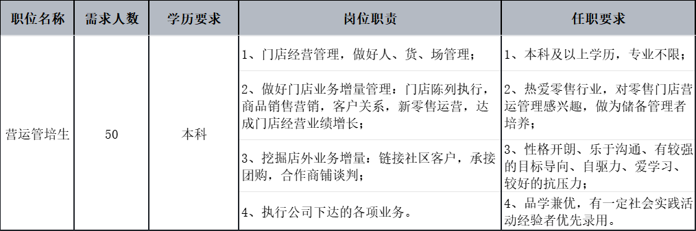 4、包括但不限于快速晋升 -极具竞争力薪酬-融洽的团队气氛 -人才落户 -人才公寓 -班车 -福利津贴 -带薪年假 -五险一金 -内部员工折扣-零售业顶尖的培训体系
