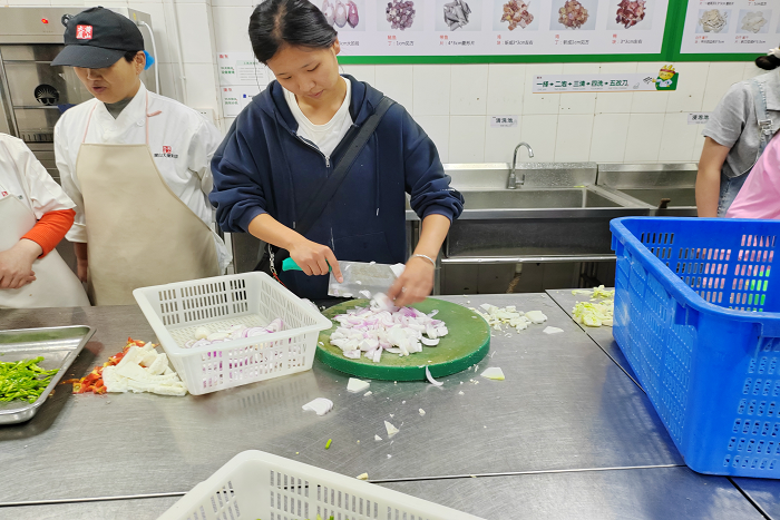在食堂厨房管理人员的带领下,同学们排队进入厨房后厨。食堂管理人员带领同学们参观了食堂的库房、切配间,安排同学们帮食堂阿姨择菜、洗菜、切菜,食堂阿姨为同学们介绍食材加工的技巧,大家在食堂阿姨的指导下完成了食品的粗加工。同学们刚开始手忙脚乱,在经过一段时间的适应后也都能够应对自如。