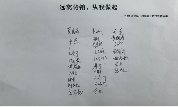 食品工程学院组织2023级学生开展反传销主题签名活动,295名学生在印有“远离传销,从我做起”的签名单上郑重的签上了姓名,本次签名活动有效引导2023级同学们树立正确人生观、价值观、就业观,提高食品工程学院学生对传销活动的辨识能力、防范能力,增强对传销的免疫力,自觉远离和抵制传销。