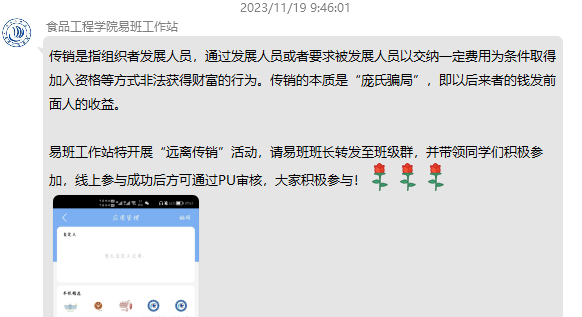 食品工程学院由辅导员组织各班级班长在教室开展反传销教育主题班会,就传销类型、传销模式、典型案例、防范方法等内容进行了宣传和预防教育。通过实际案例对学生进行讲解,使同学们对传销危害性有了清醒的认知,师生共同学习反传销相关知识,开展传销行为辨识讨论,进一步提高对传销的本质认识,提升防范意识和自我保护意识,切实增强广大学生把抵制传销的客观要求内化为自觉行动。